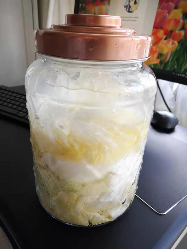 You will need a big glass jar, some Chinese cabbage or mustard green. The only ingredients adding are water and salt.