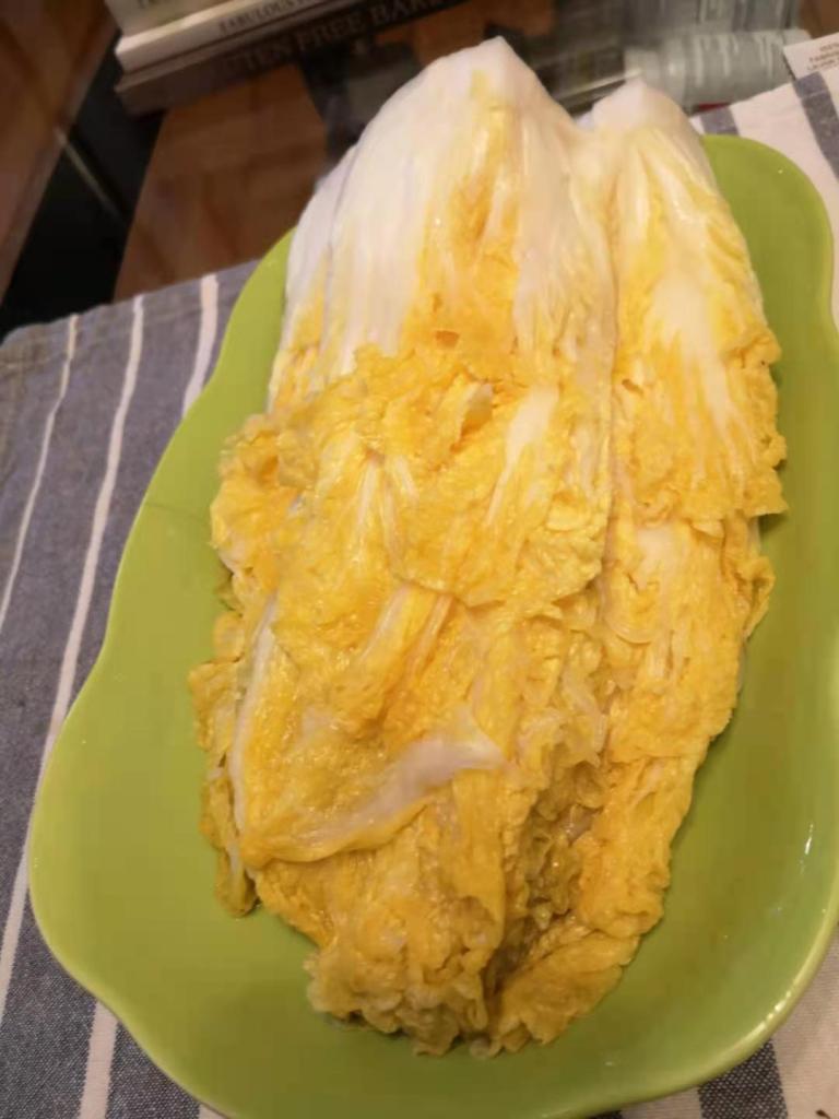 Seal the jar with the lid and keep it in a cool dark place for 2-3 weeks, it all depends on the weather, if it is warm/hot then it will ferment faster, if it is cold then it may take 4 weeks to become sour. If you use Chinese cabbage the color will go from light greenish yellow and white to beautiful yellow and white when it is ready. If you use mustard green then the color will go from bright green to brownish green like the pictures shown above.