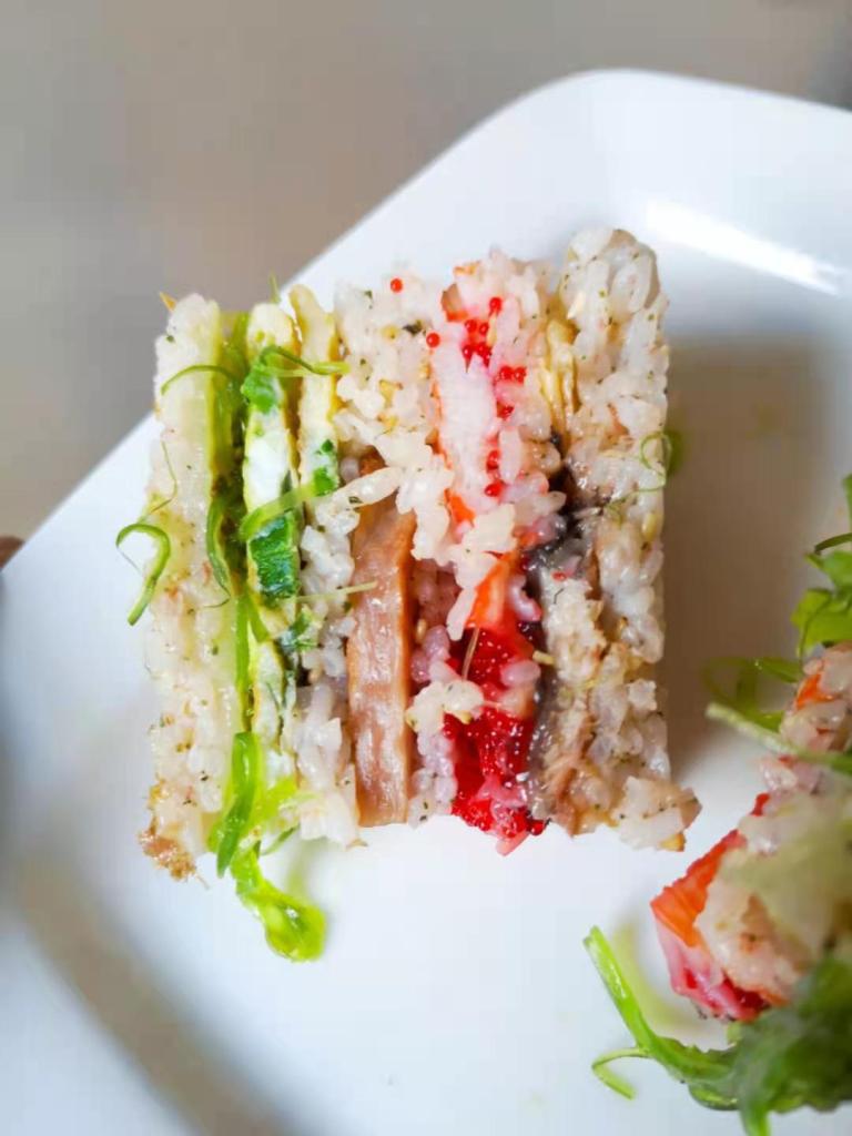 If you do not have the rice seasoning, you don’t have to use it. For the layers, use any kind of your favorite ingredients, I wanted to use avocado that day, but they were too hard to cut open. If you don’t have a cake pan, use any deep container you have at home will be fine too.
