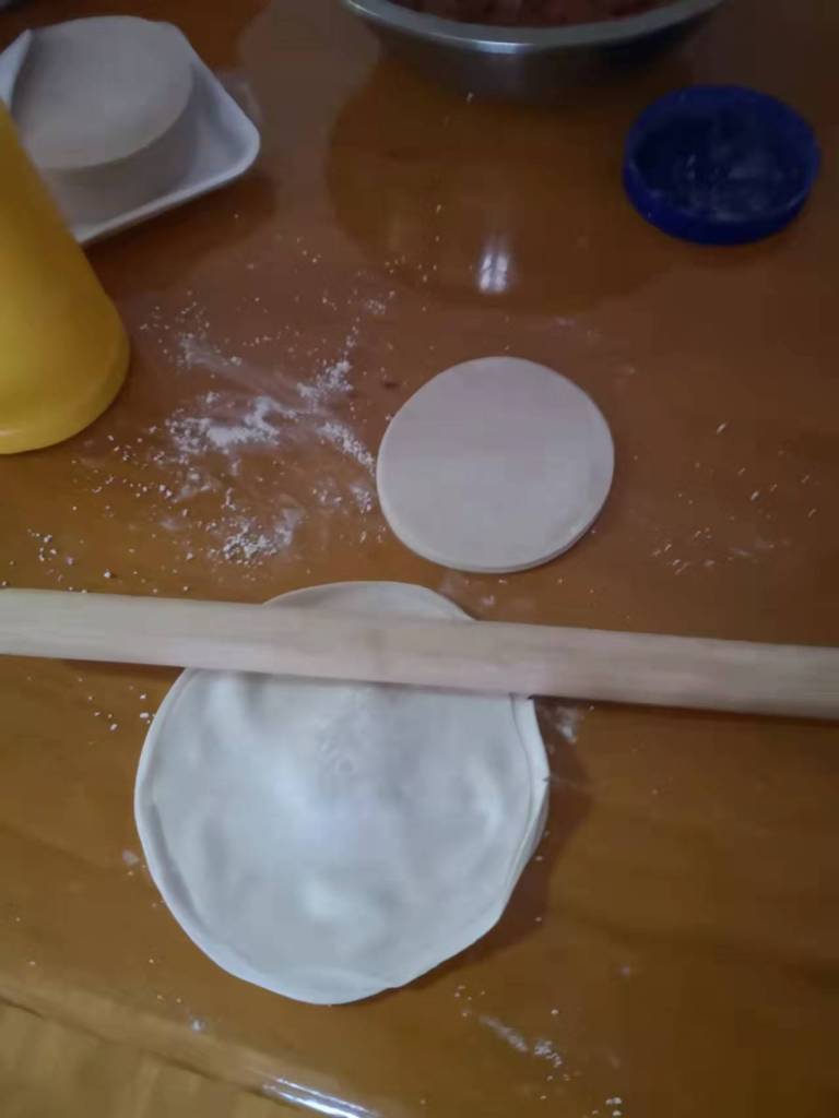 Take out 5 dumpling wraps, apply some starch between each one, and roll along the edges with a rolling pin to roll out the dumpling wraps thinner and bigger.