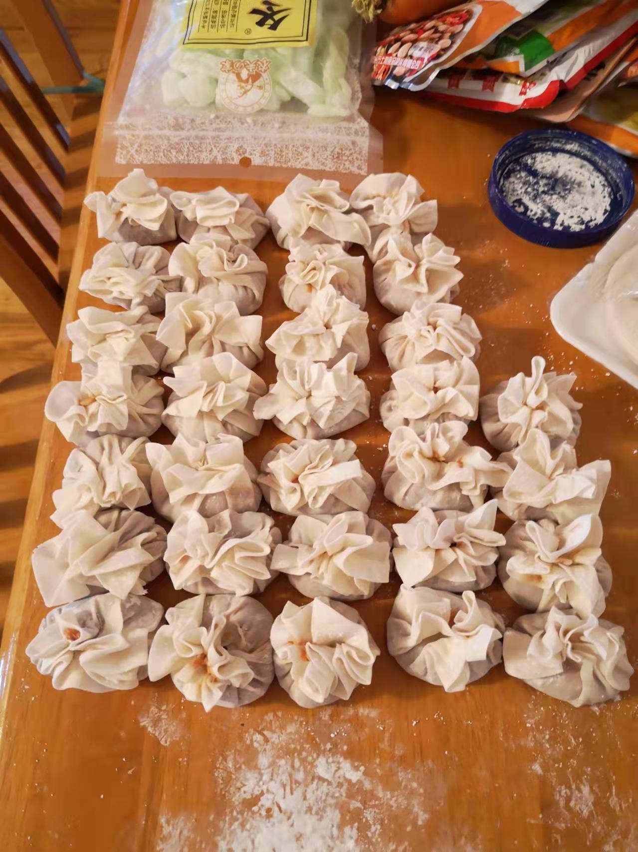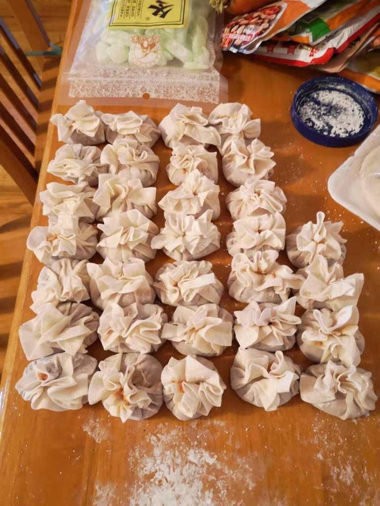 After all the dumpling wraps are rolled out, you can wrap them, put a spoonful of meat in the middle of the wrap, then fold the wrap, tightly pinch the wraps on top of the meat then slighly fix the top portion of the wrap to make it look pretty. Dont put too much meat on the wrap because we will need the extra top portion of wrap.