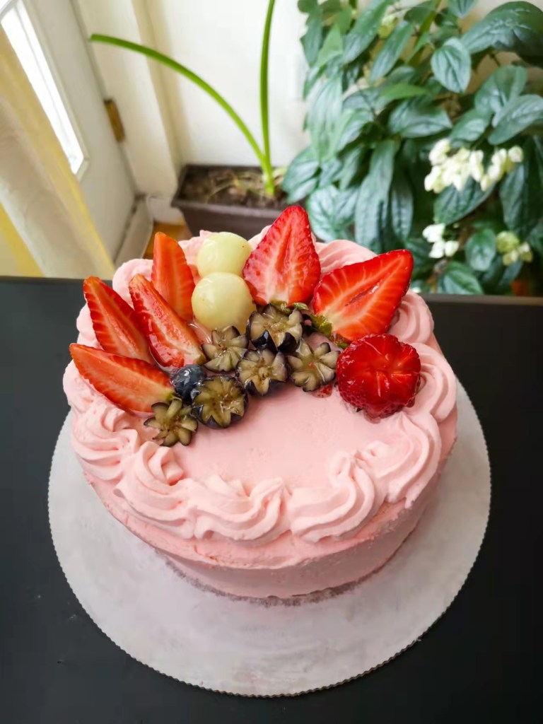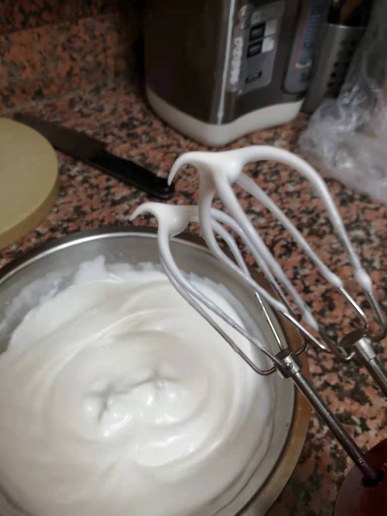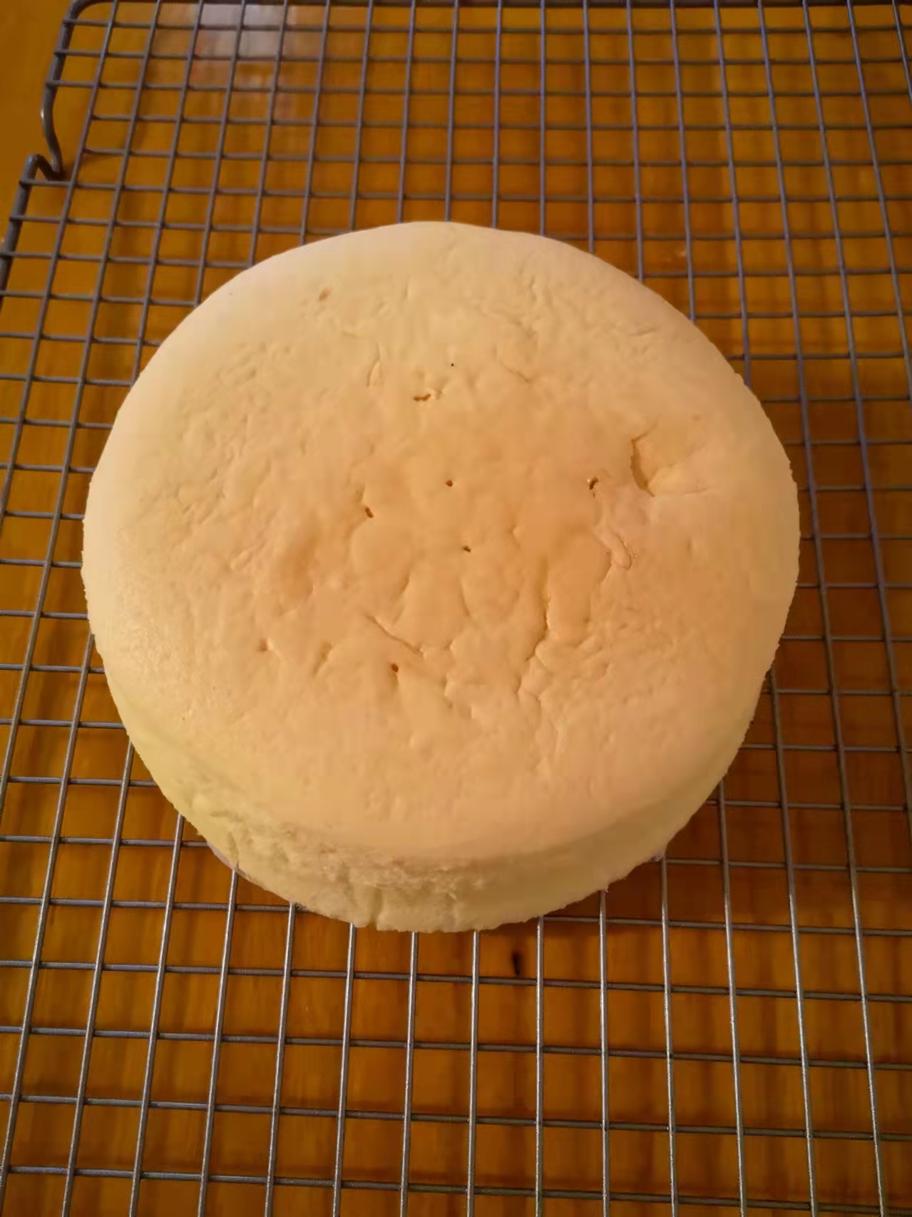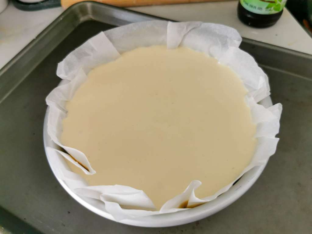 Get a 6 inch cake pan, tear a big piece of plastic wrap and cover the inside of the cake pan so when you finish the cake you can easily pull it out of the pan.