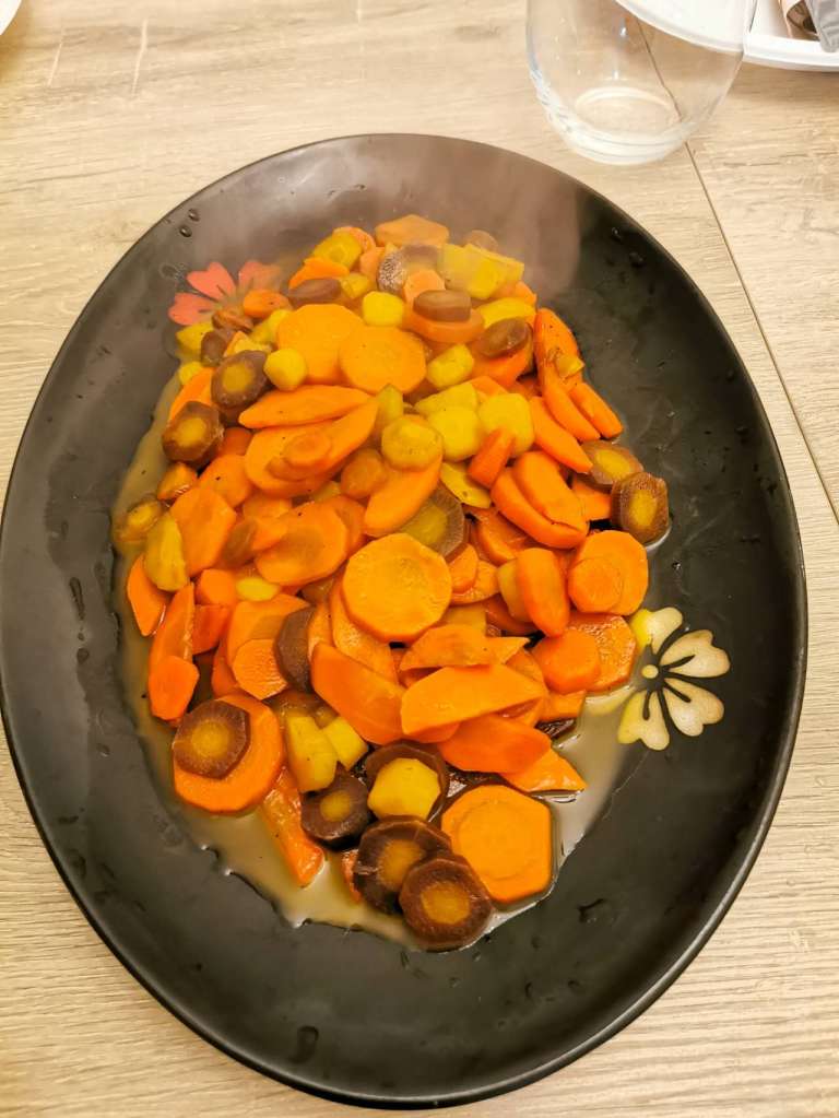Put the peppercorn and star anise in a small pot and add half a cup of water to boil until half of water is remaining. Turn the heat off and let cool. Put the lotus root and carrot in a food processor and cut it slightly, do not cut it too much just until they turn into small particles because we still want the texture of them.