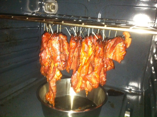 Hang the pork inside the oven with the help of paper clips. Make sure leave a baking sheet or something on the bottom with some water in it for the drippings. Roast the meat with 400F for 20-25 minutes. (Adjust the time according to how thin you slice your meat) This sauce is also good for ribs and wings. The finish product is very tender and kind of crisp with each bite. It is much better than buying from the restaurant.