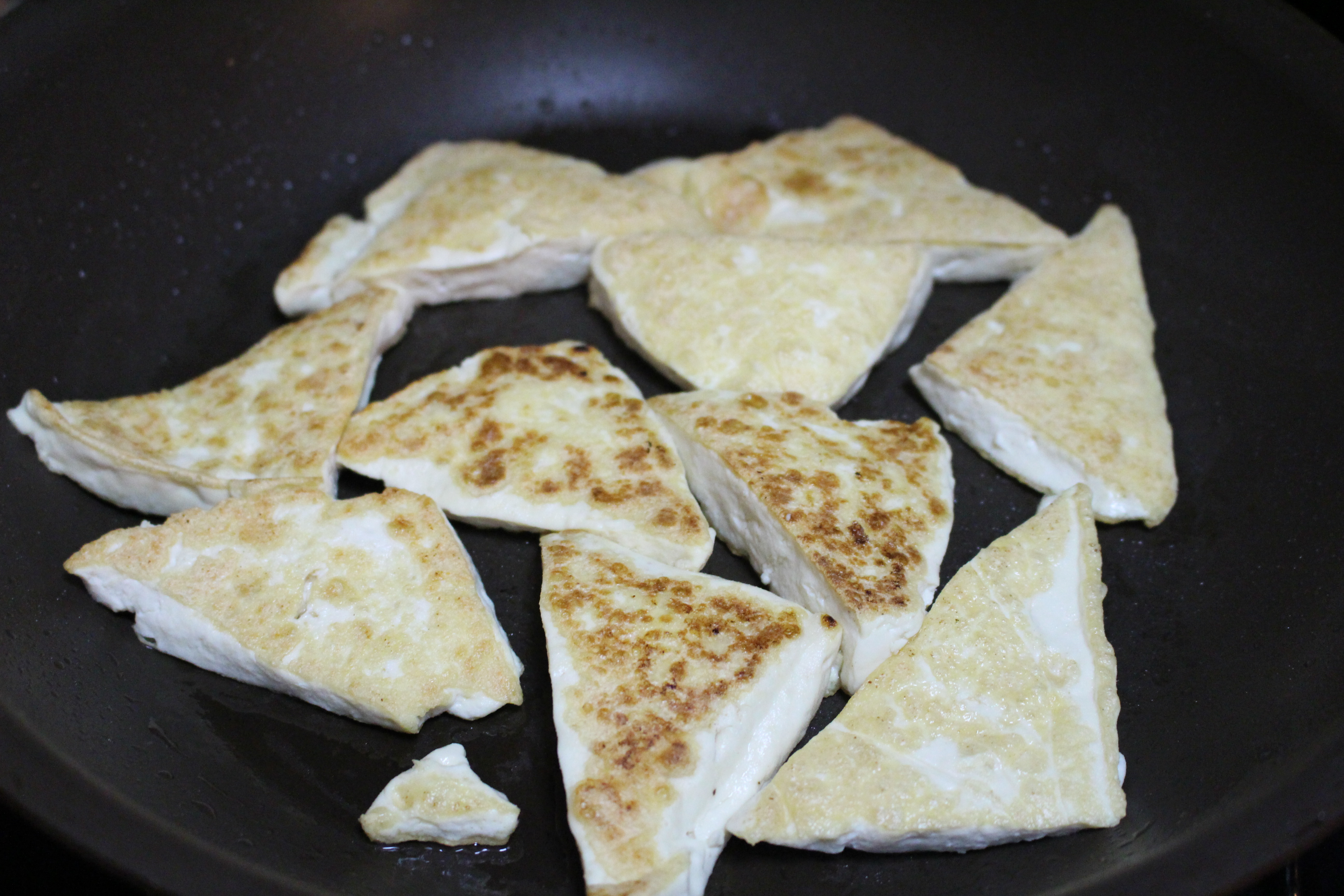 Cut tofu into thin triangle pieces, pan fried each side in a non-stick pan until each side is golden brown.