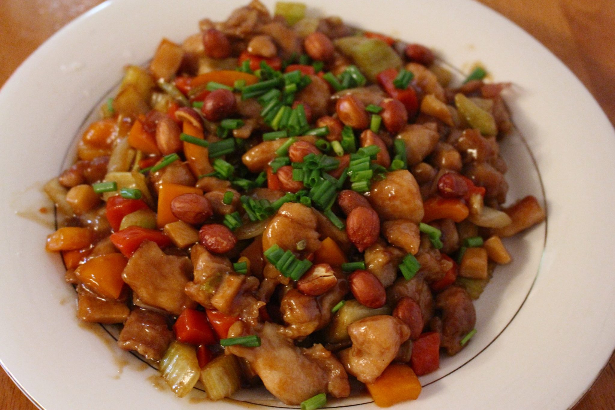 锅中剩少许油加入大葱,干辣椒段和花椒炒到出香味后加入蔬菜炒4-5分钟。接着加入鸡肉和酱汁。当酱汁开始变粘稠时加入油炸好的花生米。