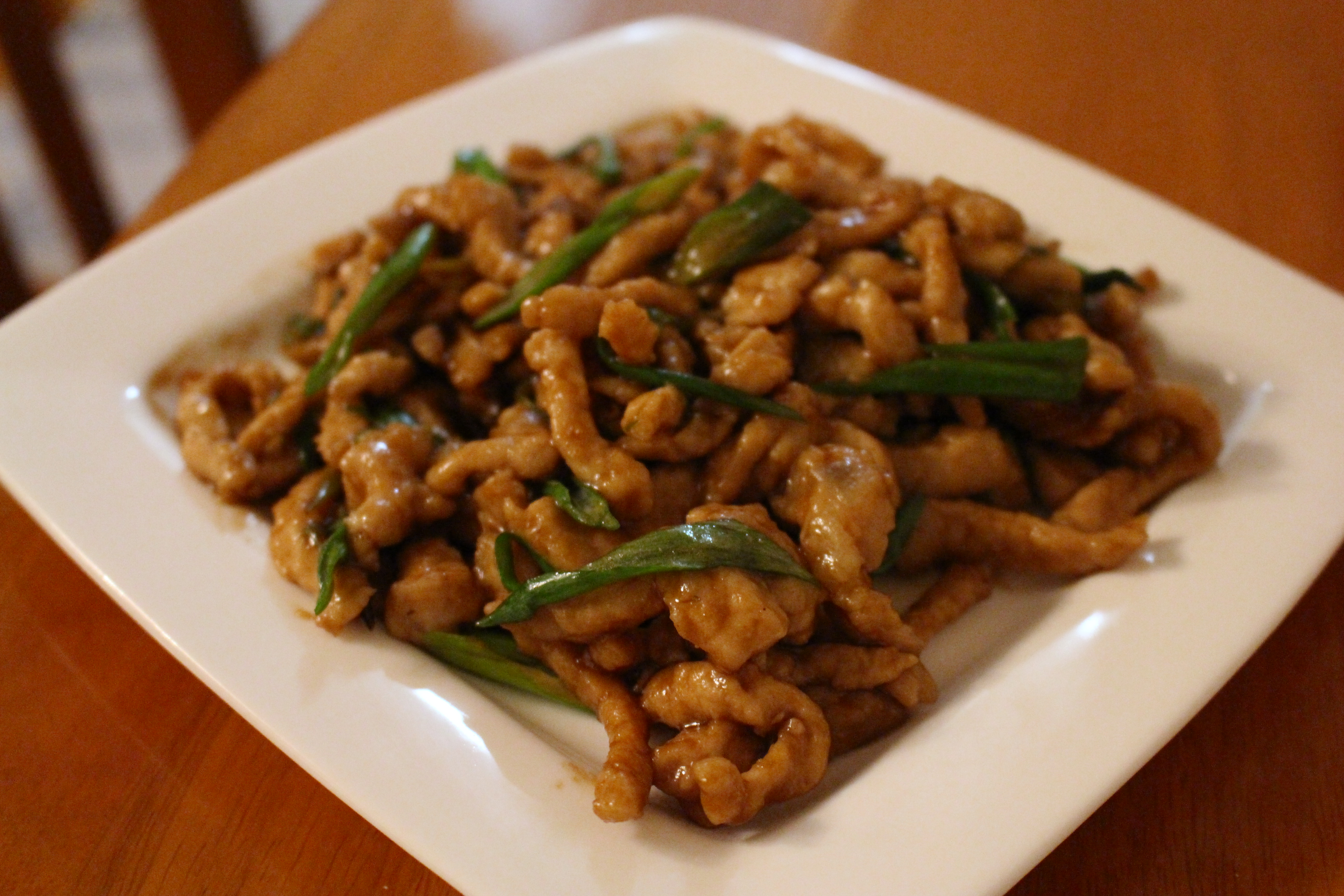 Precook pork in hot oil until they turn white about 4 minutes, set aside. Leave a little oil in the cooking skillet, add shredded white part of scallion and stir fry for a minute then add 2tbsp hoisin sauce, 1.5 tbsp mushroom oyster sauce and 3tbsp water, add in pork and mix well. Finally add in the green part of scallion.