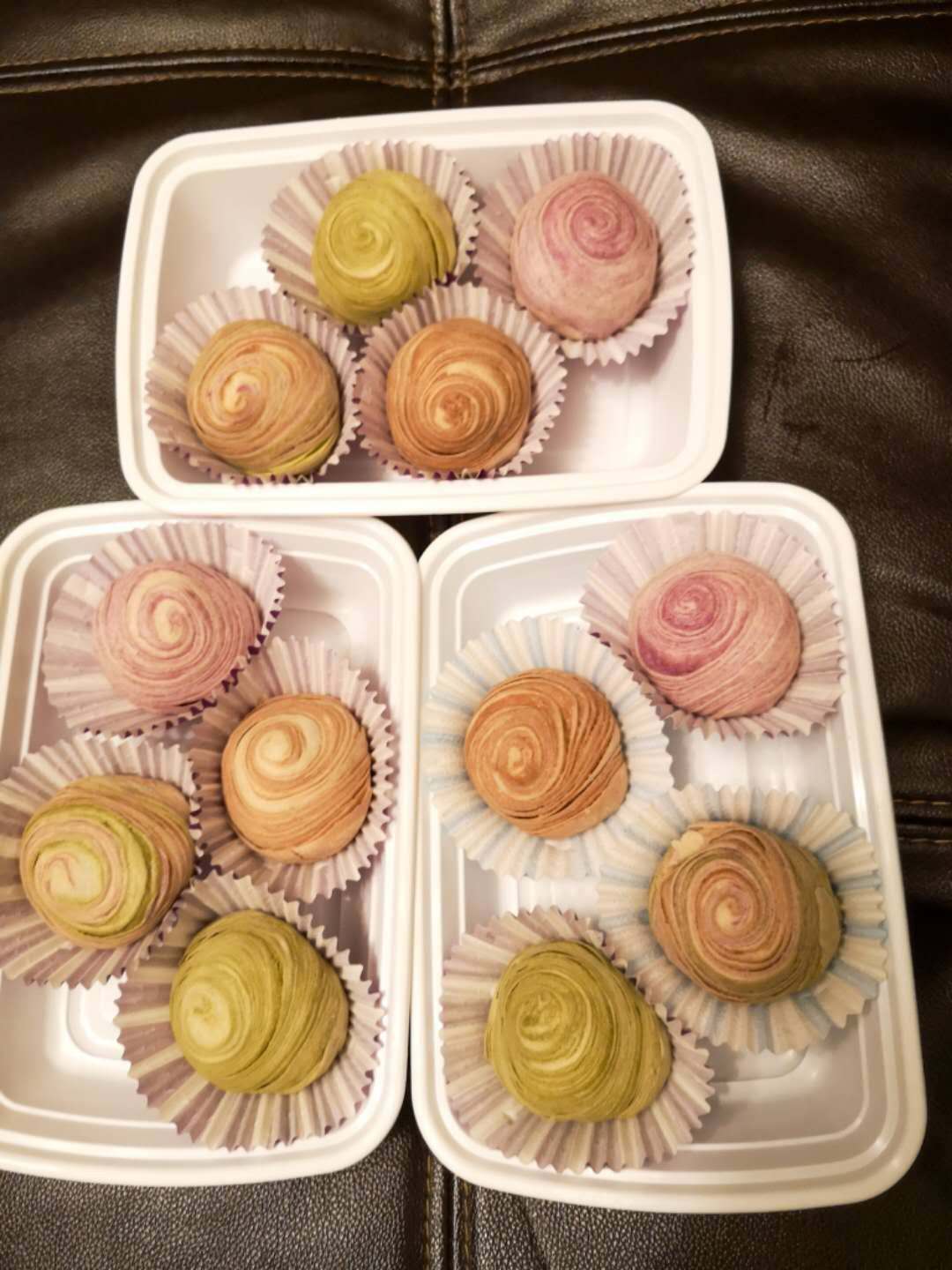 把兩個麵糰都切成8個均勻的小團,將一塊油皮麵團用擀麵杖擀開, 放個油酥在上面包起來就像下面的圖片2。