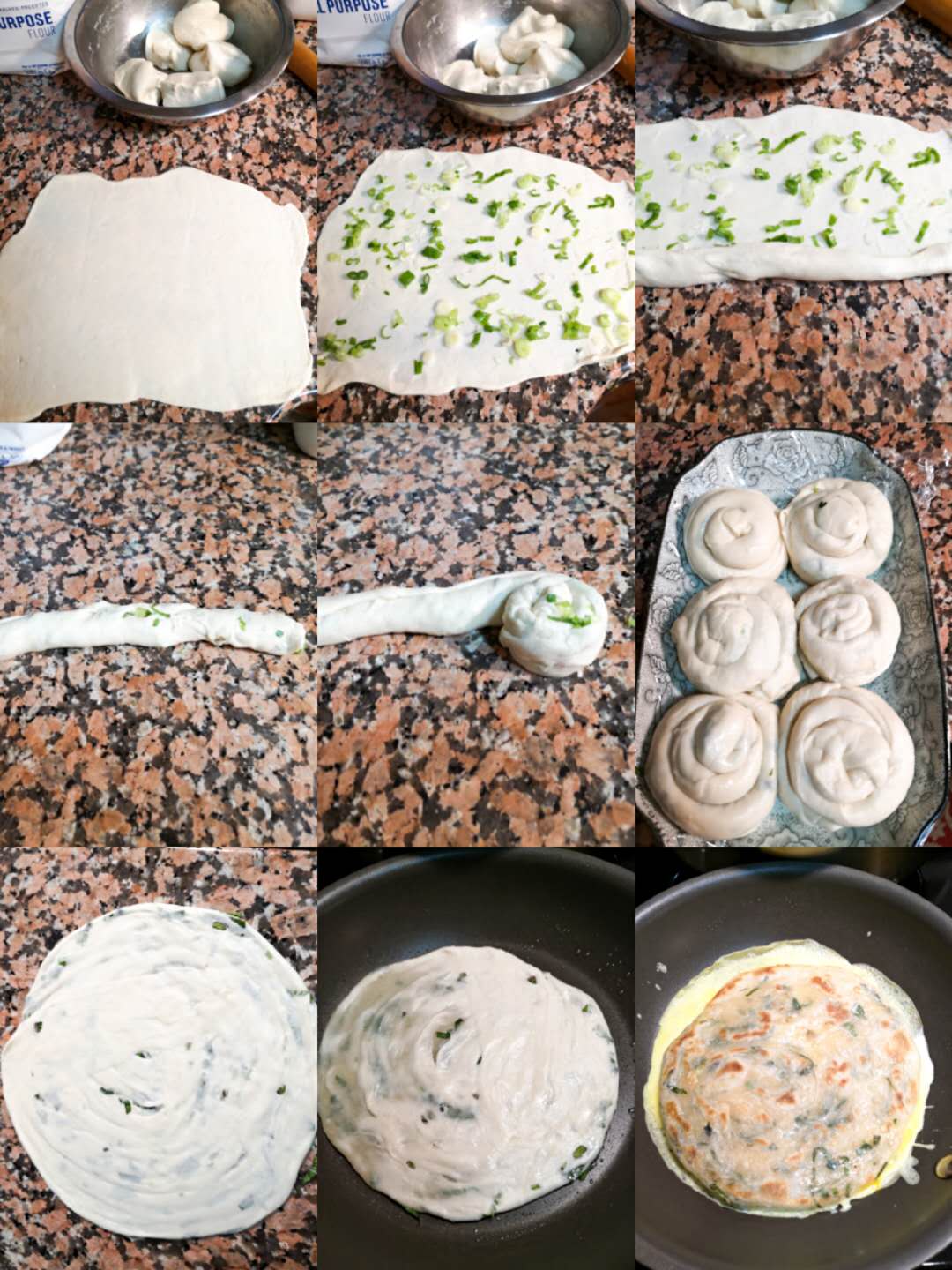 Take one and roll it out to a thin pancake with a rolling pin, spread a little bit of pork lard over the surface of the pancake. You can add the thin sliced scallion now if you want it to have scallion flavor. ( I make one with Asian basil really good).