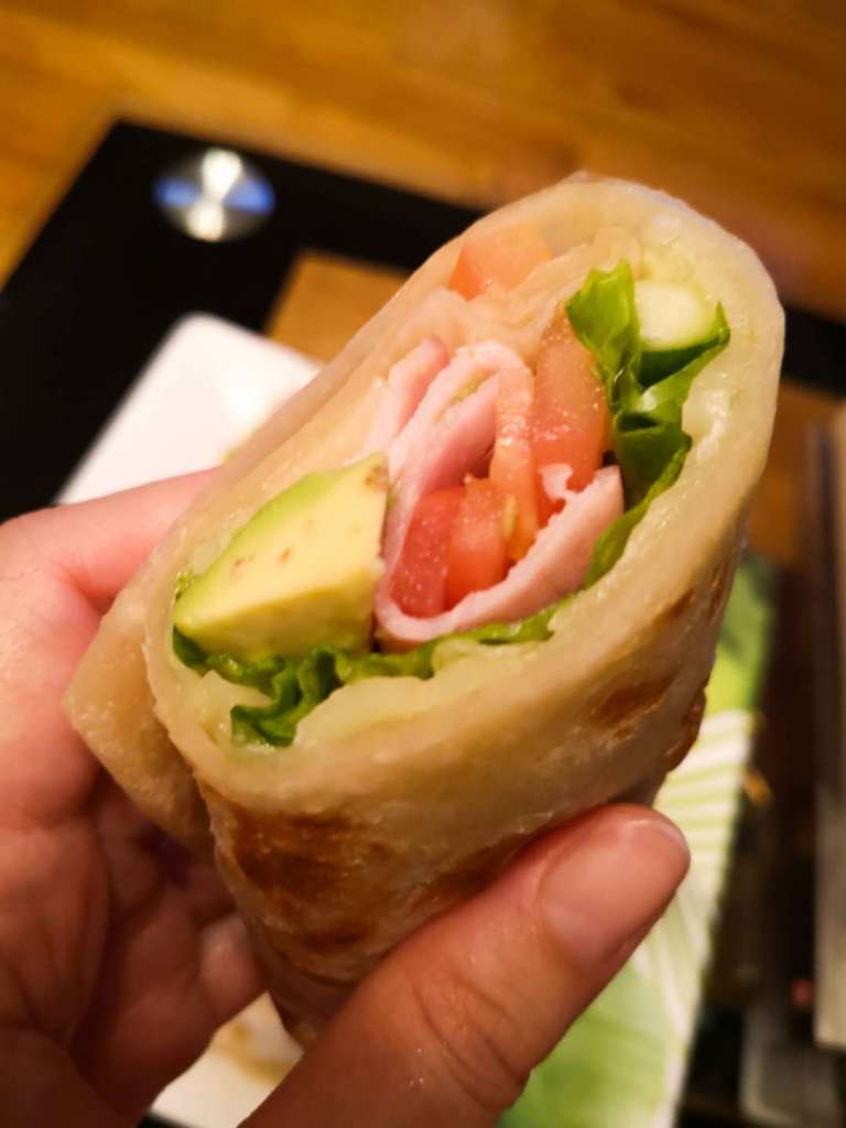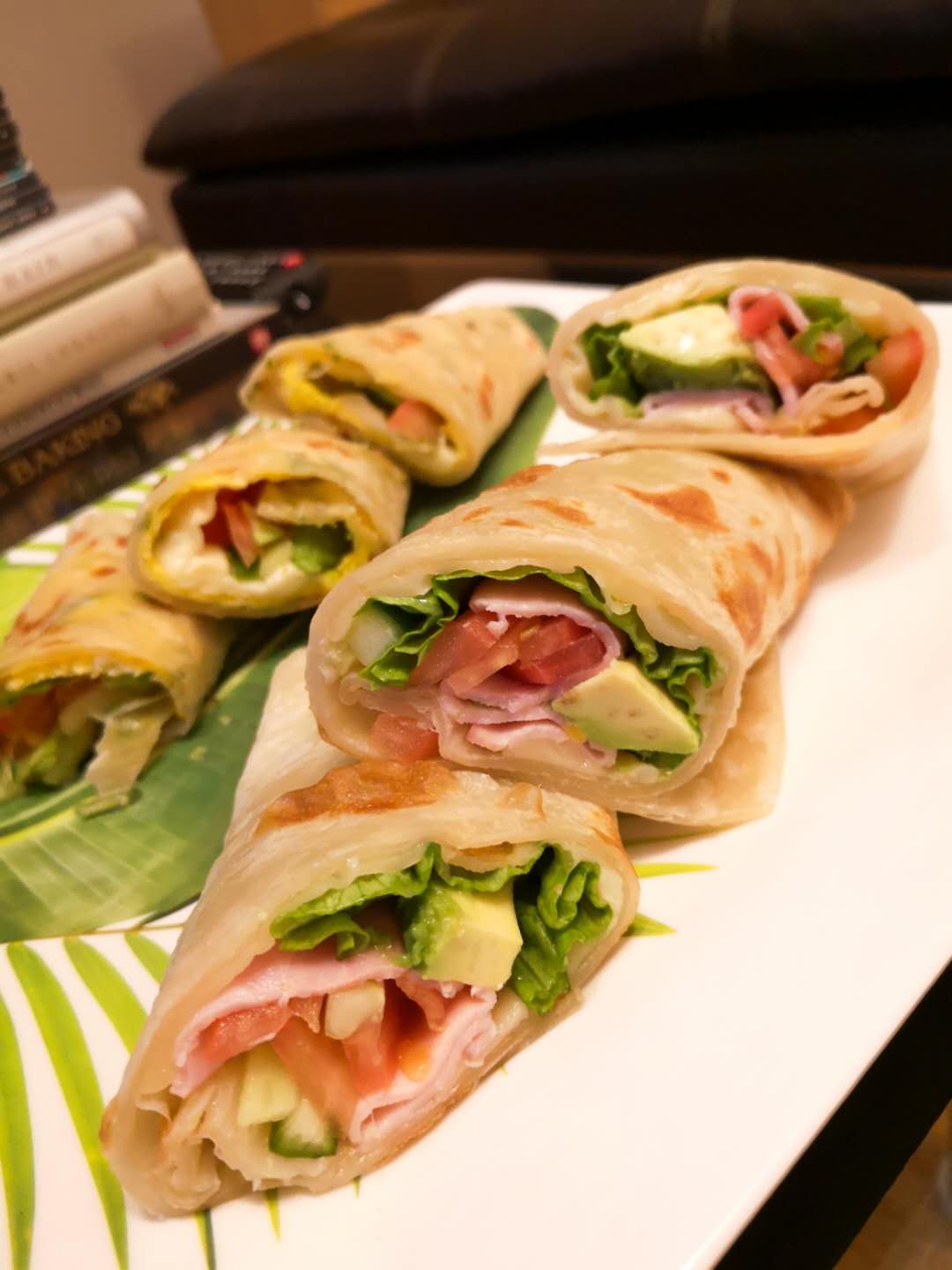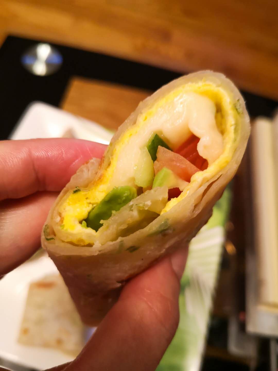 麵糰擀薄后在加了一點油的不沾鍋裏煎到透明帶點金黃就可以吃了。 就這麽吃也可以, 或者加個蛋。 打蛋倒進鍋裏,馬上拿已經煎好的餅放上去蛋煎熟了就可以吃了。 也可以像我上面圖片裏一樣加你自己喜歡吃的東西卷起來更好吃。