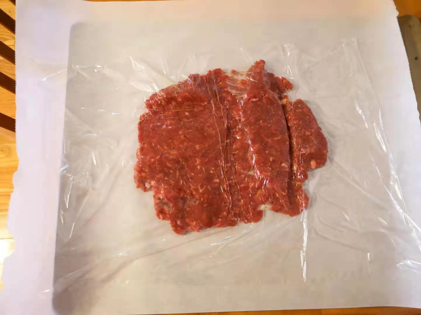 拿一張和烤盤一樣大小的羊皮紙,將1/5的肉舀到紙的中央,然後用鏟子鋪開一點,在肉上加一塊塑料薄膜或另外一張羊皮紙。使用擀麵杖將肉擀開變薄到烤盤大小。