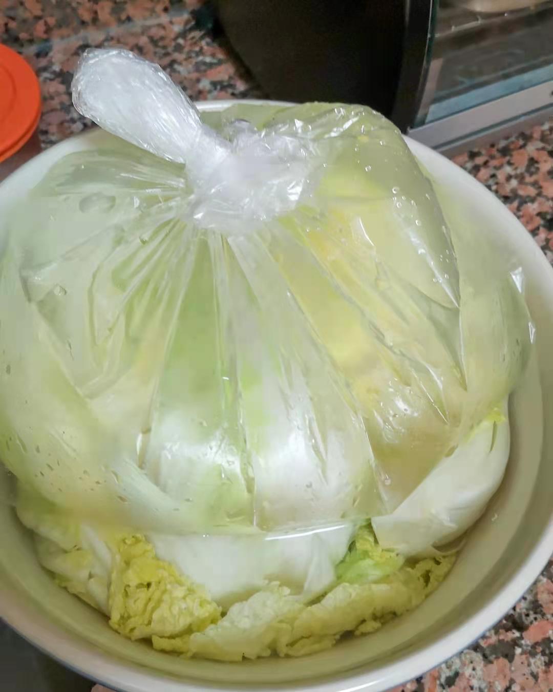 If the water is not covering the cabbage, then add more water to it. Make sure add 2% of salt again to the water(2% the weight of the water). Get a big stone to press down the vegetable and leave it on top of the vegetable to make sure the vegetable is totally under the water ( again I don’t have a stone at home either, so I use a clear plastic bag to hold enough water in it to substitute it). Seal the container with the lid and leave it for 2-3 weeks in room temperature( I seal mine with plastic wrap). Depend on the temperature, the time will vary, I did it for 2 weeks and it was sour enough for me.