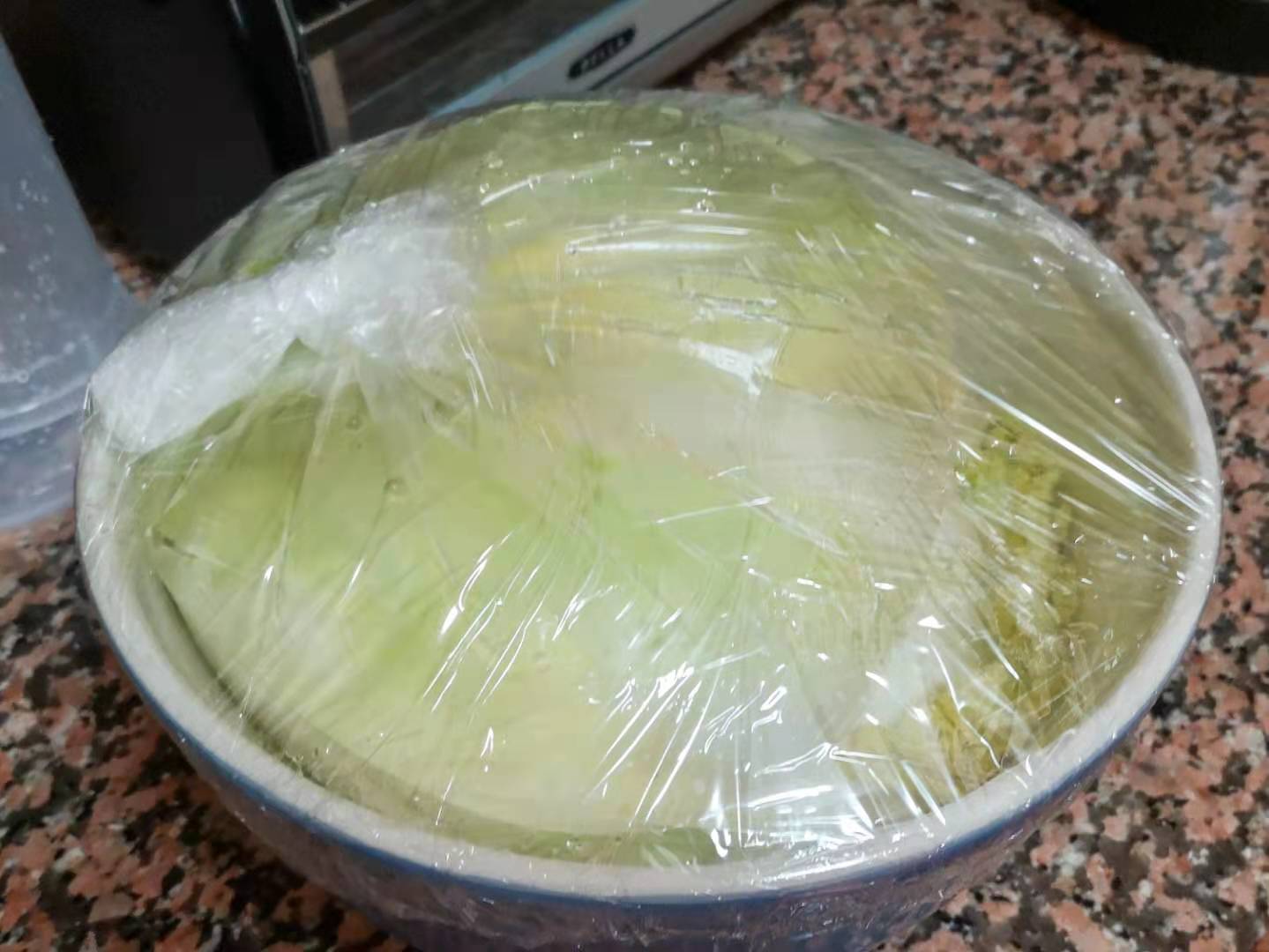 Use a glass container with lid ( I don’t have one, so I used a big china mixing bowl), add the cabbage to the glass container or bowl, make sure add the water from the vegetable back to the container too.