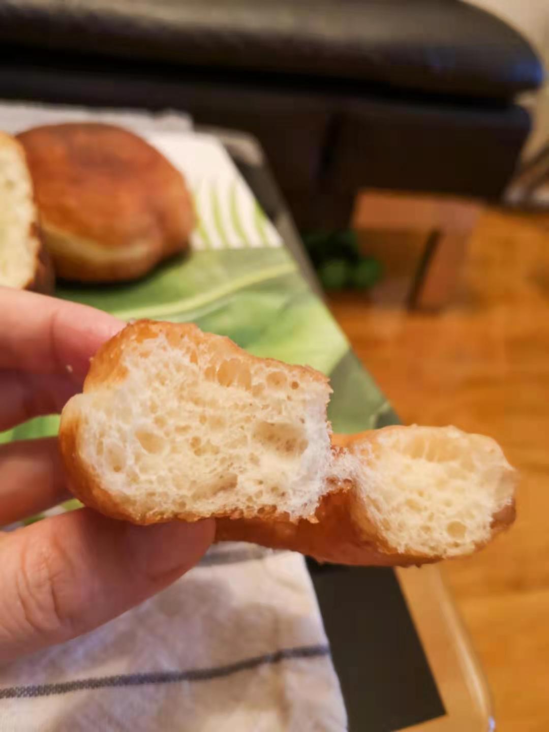 拿出第一個球,用擀麵杖擀出一個橢圓形,刷/噴一些油,然後對摺起來。