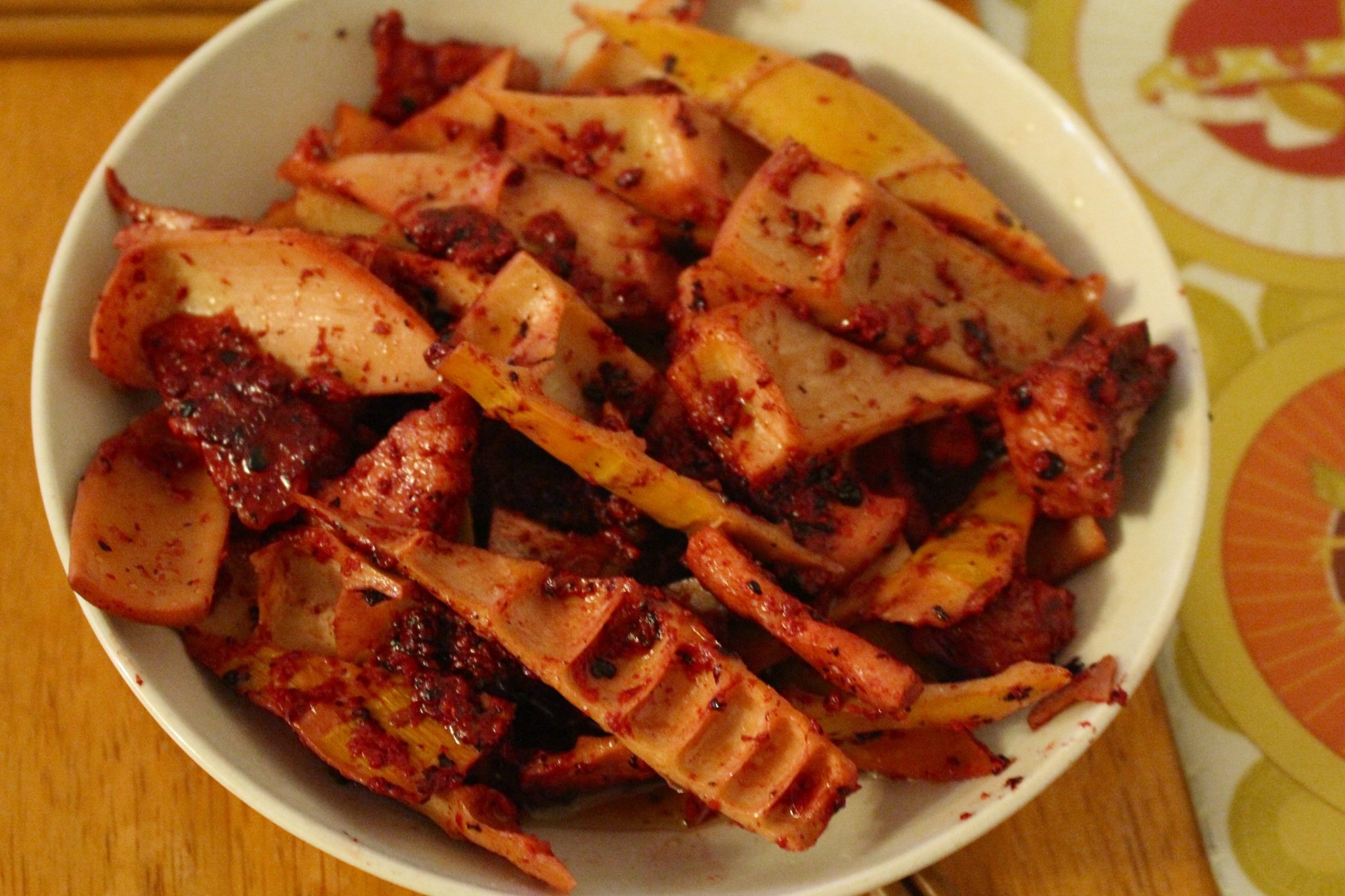 用嫩肉锄把猪扒敲得非常薄。加 鹽,黑胡椒和料酒腌渍一晚。